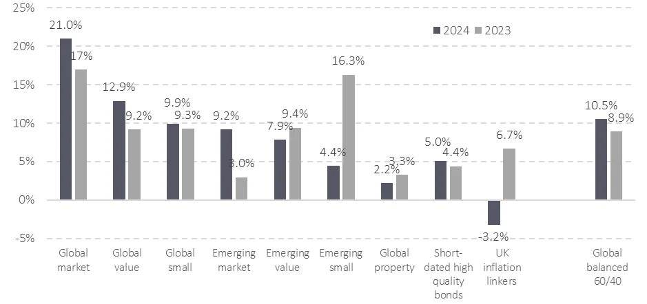 A 60% stock/40% bond global balanced portfolio strategy[1] delivered a gross return of about 10% in 2024 which, after UK inflation, grew purchasing power by over 7%. That is a pretty positive outcome on the back of a good year in 2023. Over five years, a similarly structured portfolio would have returned over 30% (after fund costs, but before any other costs).