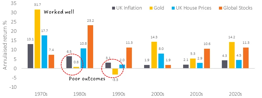 Gold has not been a particularly strong performer relative to global stocks over the past 50 years, despite its rip-roaring start to the 1970s. After the effects of inflation, £1 turned into £7 of purchasing power for gold, £3 for UK house prices and £16 for global stocks. It would have been painful to remove global stocks from a portfolio to make way for gold. In addition, the gold price was quite a bit more volatile than that of global stock markets, by about a quarter in fact.
